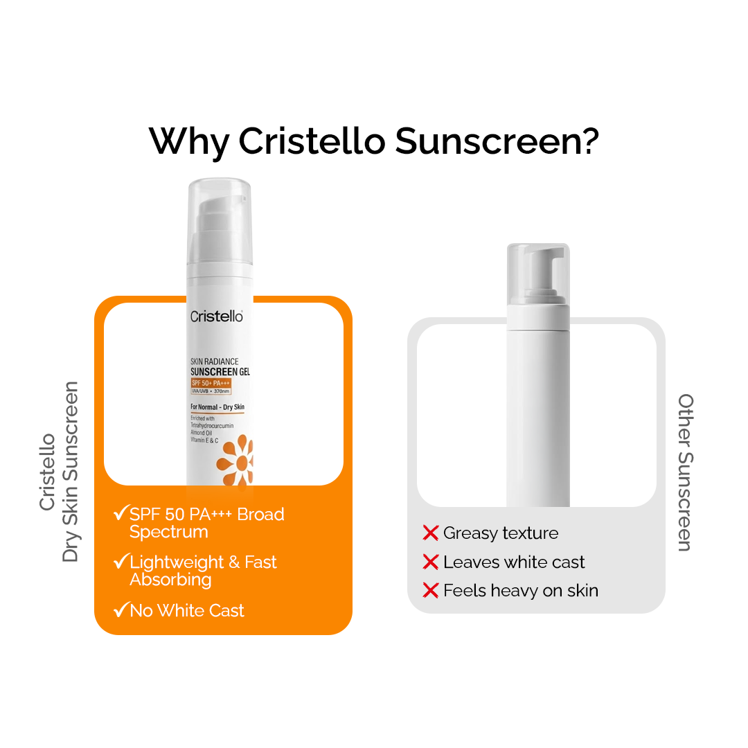 Cristello Skin Radiance Sunscreen Gel SPF 50+++ provides broad-spectrum protection against UVA/UVB rays while nourishing and hydrating your skin. Its lightweight formula with Vitamin C and Almond Oil is perfect for normal to dry skin, offering deep moisture and enhancing radiance without the greasy feel.